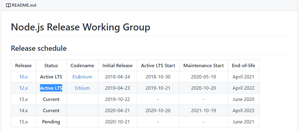 10.xと12.xのStatusはLTSなので、上記の場合12.xになります。Currentは最新版ですが、少し不安定かもしれないバージョンなのでLTSを選択しておくのが確実です。