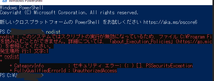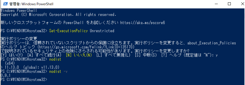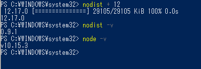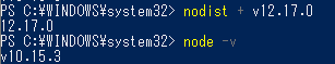 Windows + R で「ファイル名を指定して実行」を開いて「powershell」を実行し、「nodist」を入力します。