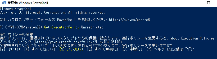 Set-ExecutionPolicy UnrestrictedWindows PowerShellが起動したら上記のコマンドを入力します。