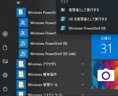 「スタートメニュー」→「Windows PowerShell」→「Windows PowerShell」を右クリック→「管理者として実行する」
