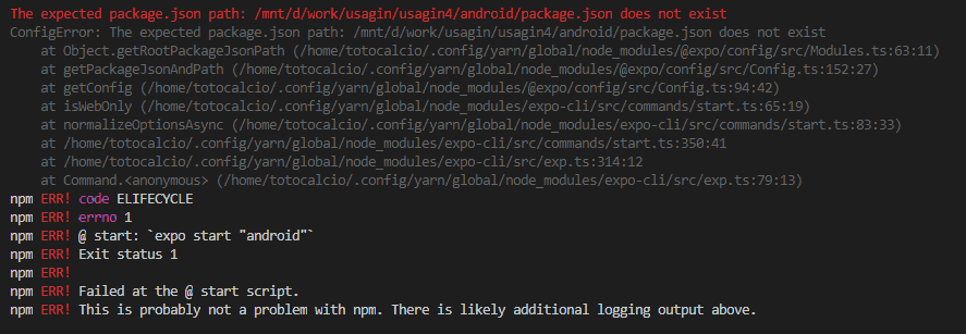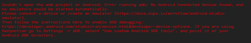 本当にすぐにエラーが出る・・・Expo Developer Tools も QR コードが表示されていない。