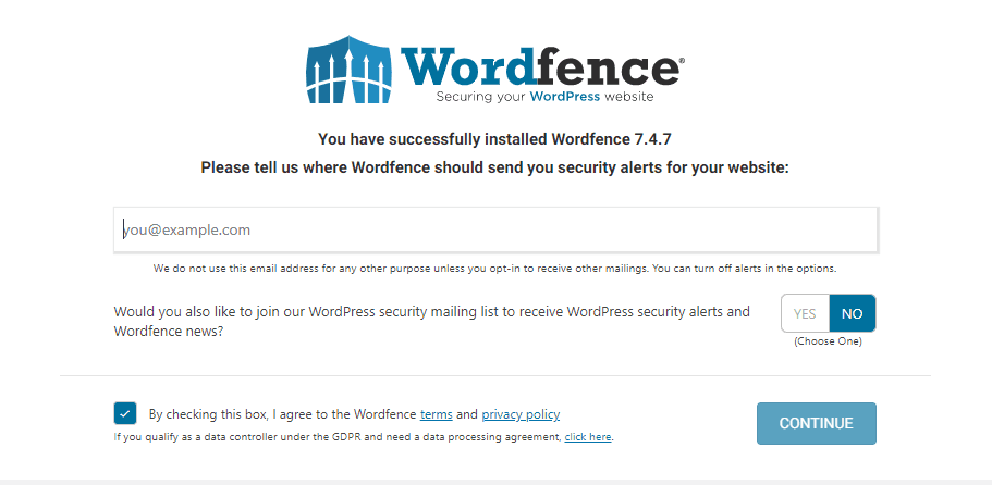メールアドレスの登録を促されるので登録します。 WordPress や Wordfence のニュースを受け取るかどうか選びます。どちらでもいいです。 プライバシーポリシーにはチェックを入れましょう。