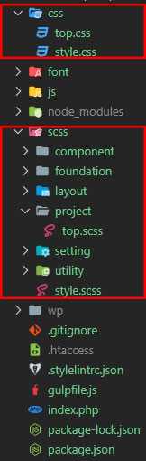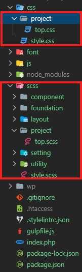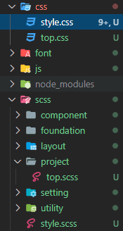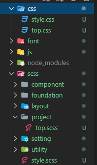 project ディレクトリの scss は単体で css を出力します。その時 project ディレクトリも css の下に作られてしまいます。 期待する動きは下記のように css の下にはディレクトリを作らず css ファイルが並ぶ形です。